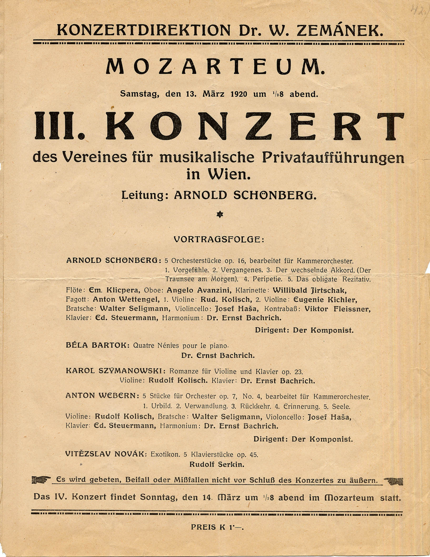 Konzertprogramm zum 3. Konzert des Vereines für musikalische Privataufführungen im Mozarteum, 13. März 1920